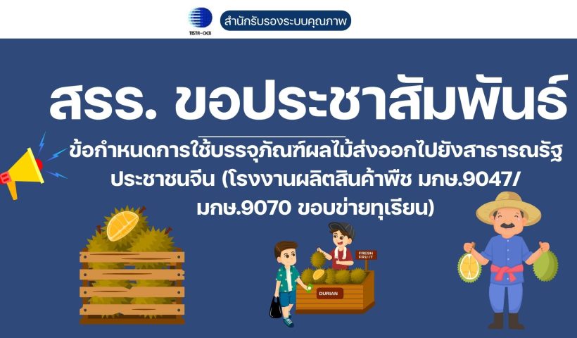 View More สรร. ขอแจ้งประชาสัมพันธ์ เรื่อง ข้อกำหนดการใช้บรรจุภัณฑ์ผลไม้ส่งออกไปยังสาธารณรัฐประชาชนจีน (โรงงานผลิตสินค้าพืช มกษ.9047/มกษ.9070 ขอบข่ายทุเรียน)ผู้เขียน: OCB admin