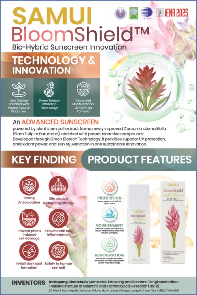 ดร.รจนา ตั้งกุลบริบูรณ์ รองผู้ว่าการยุทธศาสตร์และจัดการนวัตกรรม สถาบันวิจัยวิทยาศาสตร์และเทคโนโลยีแห่งประเทศไทย (วว.) กระทรวงการอุดมศึกษา วิทยาศาสตร์ วิจัยและนวัตกรรม (อว.) พร้อมด้วย ผศ.ดร. ณัฐพงค์ จันจุฬา นักวิจัยศูนย์เชี่ยวชาญนวัตกรรมเกษตรสร้างสรรค์ (ศนก.) ดร.สมกมล อินทวงค์ นักวิจัยศูนย์เชี่ยวชาญนวัตกรรมผลิตภัณฑ์สมุนไพร (ศนส.) นำเสนอผลงาน สมุยบลูมชีลด์: นวัตกรรมกันแดดสเต็มเซลล์พืชจากดอกปทุมมาสายพันธุ์ใหม่ (Samui BloomShield™: Bio-Hybrid Sunscreen Innovation) ในเวทีประกวดนานาชาติ “The International Trade Fair-Ideas, Inventions and New products” หรือ iENA 2025 ระหว่างวันที่ 1-3 พฤศจิกายน 2568 ณ เมืองนูเรมเบิร์ก สหพันธ์สาธารณรัฐเยอรมนี โอกาสนี้ วว. ได้ร่วมนำเสนอผลงานให้แก่ นางสาวกนกพร ควรคิด รองกงสุลใหญ่ ณ นครมิวนิก ที่ได้เดินทางมาเยี่ยมชมผลงานนักประดิษฐ์นักวิจัยไทย