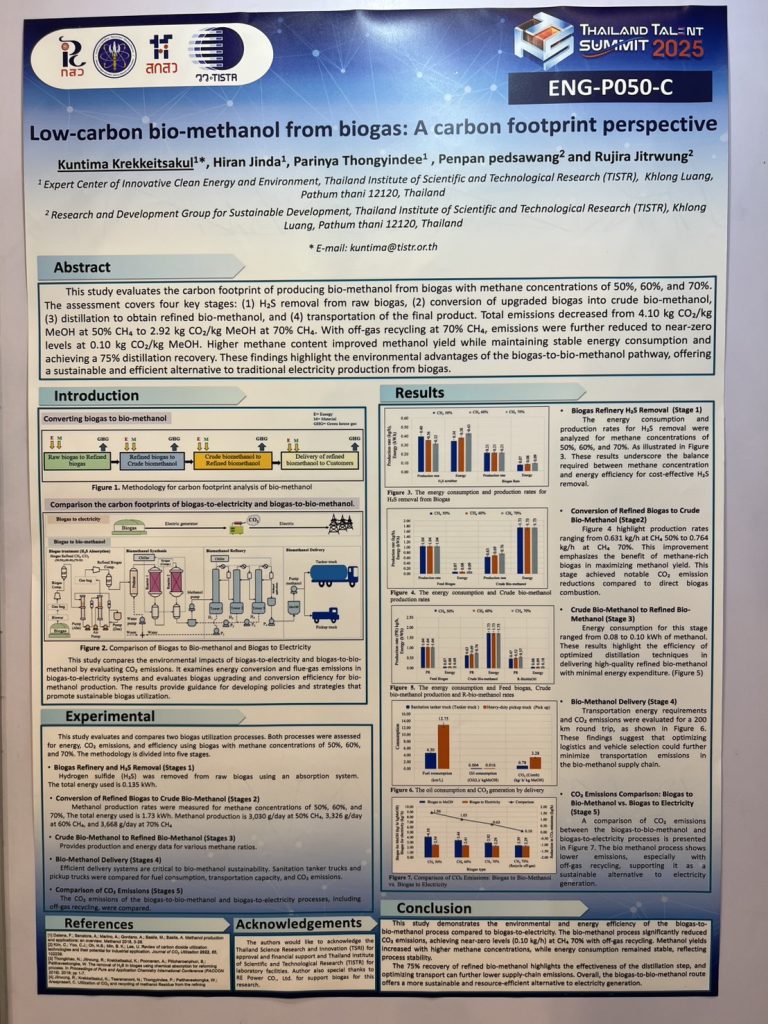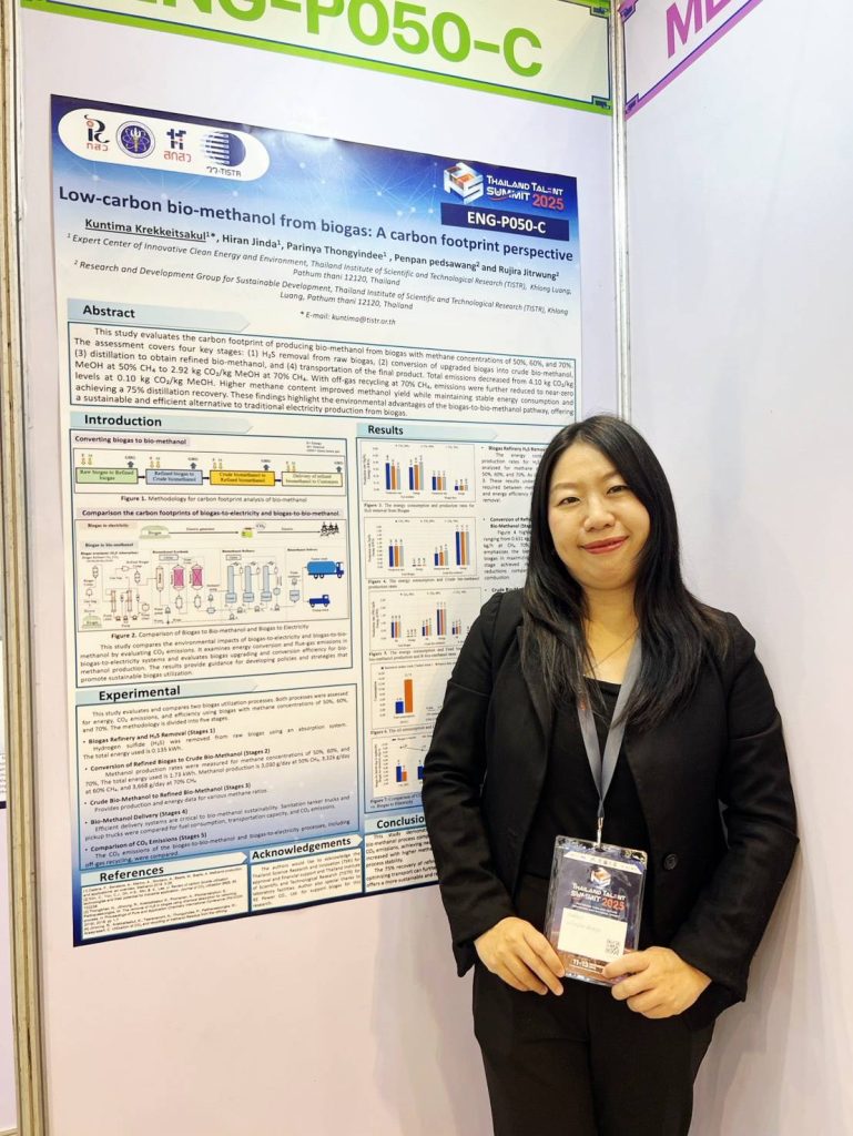2) นางสาวกันทิมา เกริกเกียรติสกุล นักวิจัย ศูนย์เชี่ยวชาญนวัตกรรมพลังงานสะอาดและสิ่งแวดล้อม นำเสนอผลงาน Low – carbon bio-methanol from biogas : A carbon footprint perspective