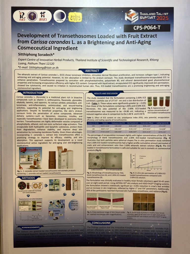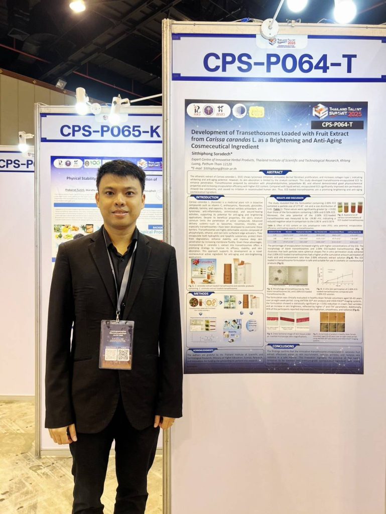 1) ดร.สิทธิพงศ์ สรเดช นักวิจัยอาวุโส ศูนย์เชี่ยวชาญนวัตกรรมผลิตภัณฑ์สมุนไพร นำเสนอผลงาน “Development of Transethosomes Loaded with Fruit Extract from Carissa carandas L. as a Brightening and Anti-Aging Cosmeceutical Ingredient”