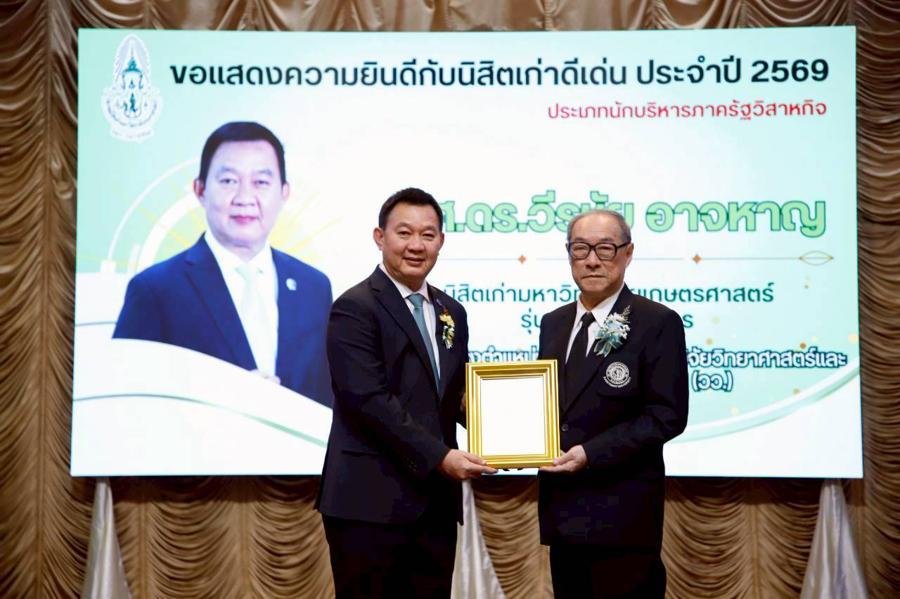 ผศ.ดร.วีรชัย อาจหาญ ผู้ว่าการ สถาบันวิจัยวิทยาศาสตร์และเทคโนโลยีแห่งประเทศไทย (วว.) กระทรวงการอุดมศึกษา วิทยาศาสตร์ วิจัยและนวัตกรรม (อว.) ซึ่งเป็นนิสิตเก่า มหาวิทยาลัยเกษตรศาสตร์ (มก.) รุ่น 50 เข้ารับโล่นิสิตเก่าดีเด่น มหาวิทยาลัยเกษตรศาสตร์ ประจำปี 2569 ประเภทนักบริหารภาครัฐวิสาหกิจ โดยเป็นหนึ่งในกิจกรรมสำคัญที่จัดขึ้นเนื่องในงานครบรอบ 83 ปี คล้ายวันสถาปนามหาวิทยาลัยเกษตรศาสตร์