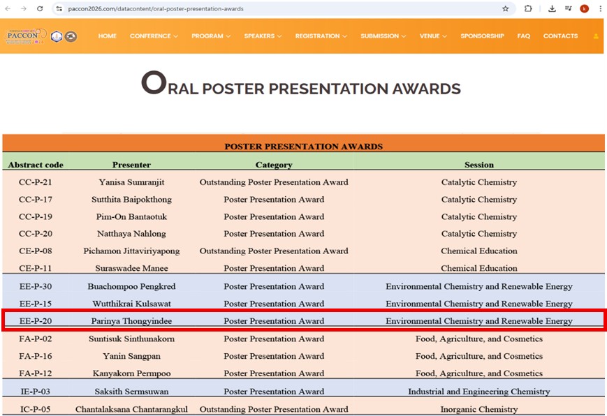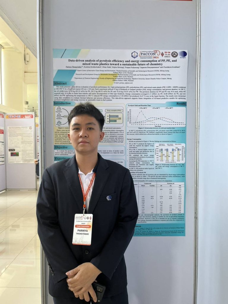 ขอแสดงความยินดี ในโอกาส นายปริญญา ทองยินดี นักทดลองวิทยาศาสตร์วิจัย ศูนย์เชี่ยวชาญนวัตกรรมพลังงานสะอาดและสิ่งแวดล้อม (ศนพ.) สถาบันวิจัยวิทยาศาสตร์และเทคโนโลยีแห่งประเทศไทย (วว.) กระทรวงการอุดมศึกษา วิทยาศาสตร์ วิจัยและนวัตกรรม (อว.) ภายใต้การกำกับดูแลงานวิจัย โดย ดร.รุจิรา จิตรหวัง ผู้เชี่ยวชาญวิจัย กลุ่มวิจัยและพัฒนาด้านพัฒนาอย่างยั่งยืน (พย.) ที่ได้รับรางวัล Best Poster Presentation Awards 2026 ในหัวข้องานวิจัยเรื่อง “Data-driven analysis of pyrolysis efficiency and energy consumption of PP, PE, and mixed waste plastics toward a sustainable future of chemistry” Sessions Environmental Chemistry and Renewable Energy (EE)