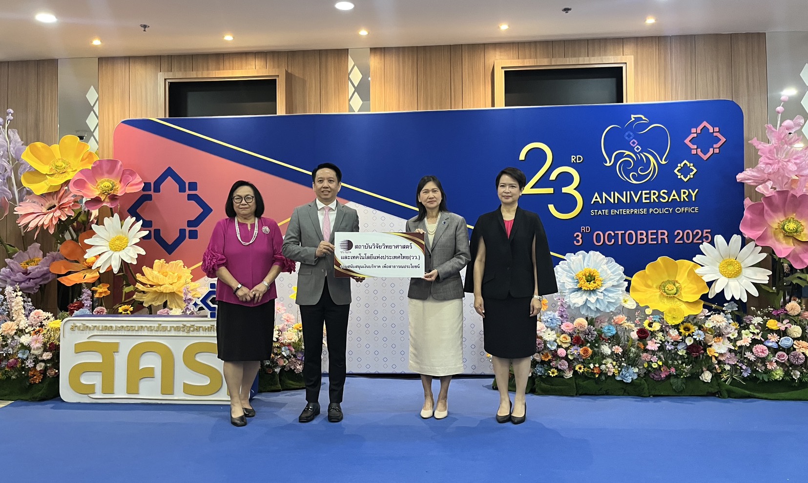 นางสาวกาญจนา ทุมมานนท์ ผู้อำนวยการ สำนักผู้ว่าการ เป็นผู้แทน สถาบันวิจัยวิทยาศาสตร์และเทคโนโลยีแห่งประเทศไทย (วว.) กระทรวงการอุดมศึกษา วิทยาศาสตร์ วิจัยและนวัตกรรม (อว.) ร่วมสนับสนุนเงินบริจาคเพื่อสาธารณประโยชน์ เนื่องในวันคล้ายวันสถาปนา สำนักงานคณะกรรมการนโยบายรัฐวิสาหกิจ (สคร.) ครบรอบปีที่ 23 โดยมี นายธิบดี วัฒนกุล ผู้อำนวยการ สคร.พร้อมคณะผู้บริหาร เป็นผู้รับมอบ เมื่อวันที่ 3 ตุลาคม 2568 ณ บริเวณชั้น 15 อาคาร 150 ปี กระทรวงการคลัง เขตพญาไท กรุงเทพฯ