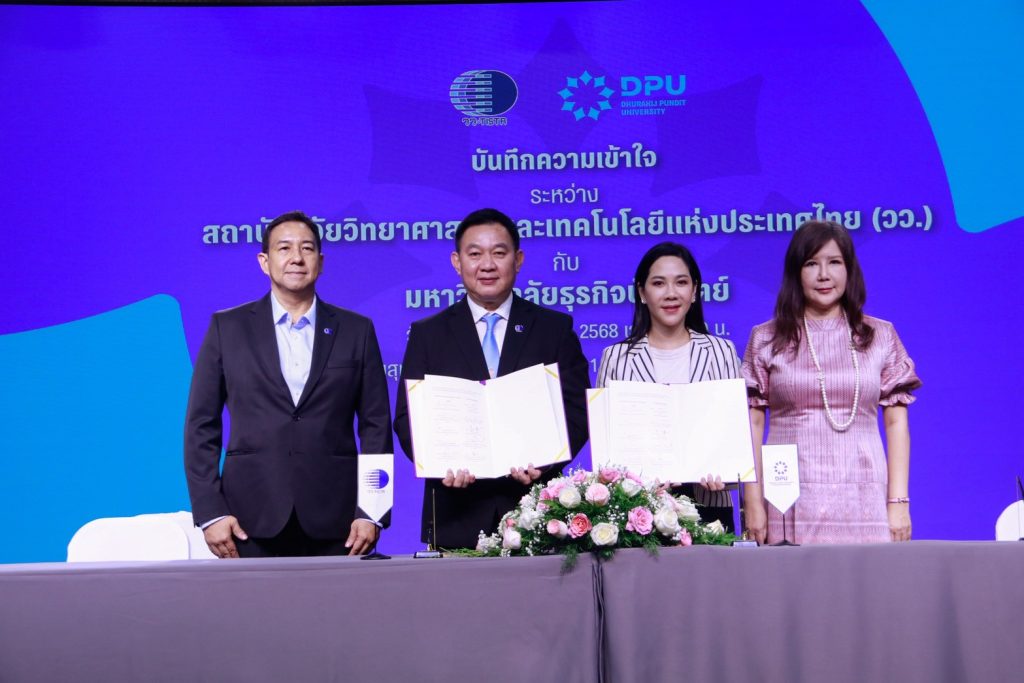 กระทรวงการอุดมศึกษา วิทยาศาสตร์ วิจัยและนวัตกรรม (อว.) โดย ผศ.ดร.วีรชัย อาจหาญ ผู้ว่าการ สถาบันวิจัยวิทยาศาสตร์และเทคโนโลยีแห่งประเทศไทย (วว.) และ ดร.ดาริกา ลัทธพิพัฒน์ อธิการบดี มหาวิทยาลัยธุรกิจบัณฑิตย์ (DPU) ร่วมลงนามบันทึกข้อตกลงความเข้าใจว่าด้วยความร่วมมือในการศึกษา วิจัย และเชื่อมโยงเครือข่ายการพัฒนาผลิตภัณฑ์เพื่อส่งเสริมการมีสุขภาพที่ดี โดยมี ดร.พงศธร ประภักรางกูล รองผู้ว่าการวิจัยและพัฒนาด้านอุตสาหกรรมชีวภาพ วว. และ ผศ.ดร.พัทธนันท์ เพชรเชิดชู รองอธิการบดีสายงานวิชาการและวิจัยร่วมเป็นสักขีพยาน