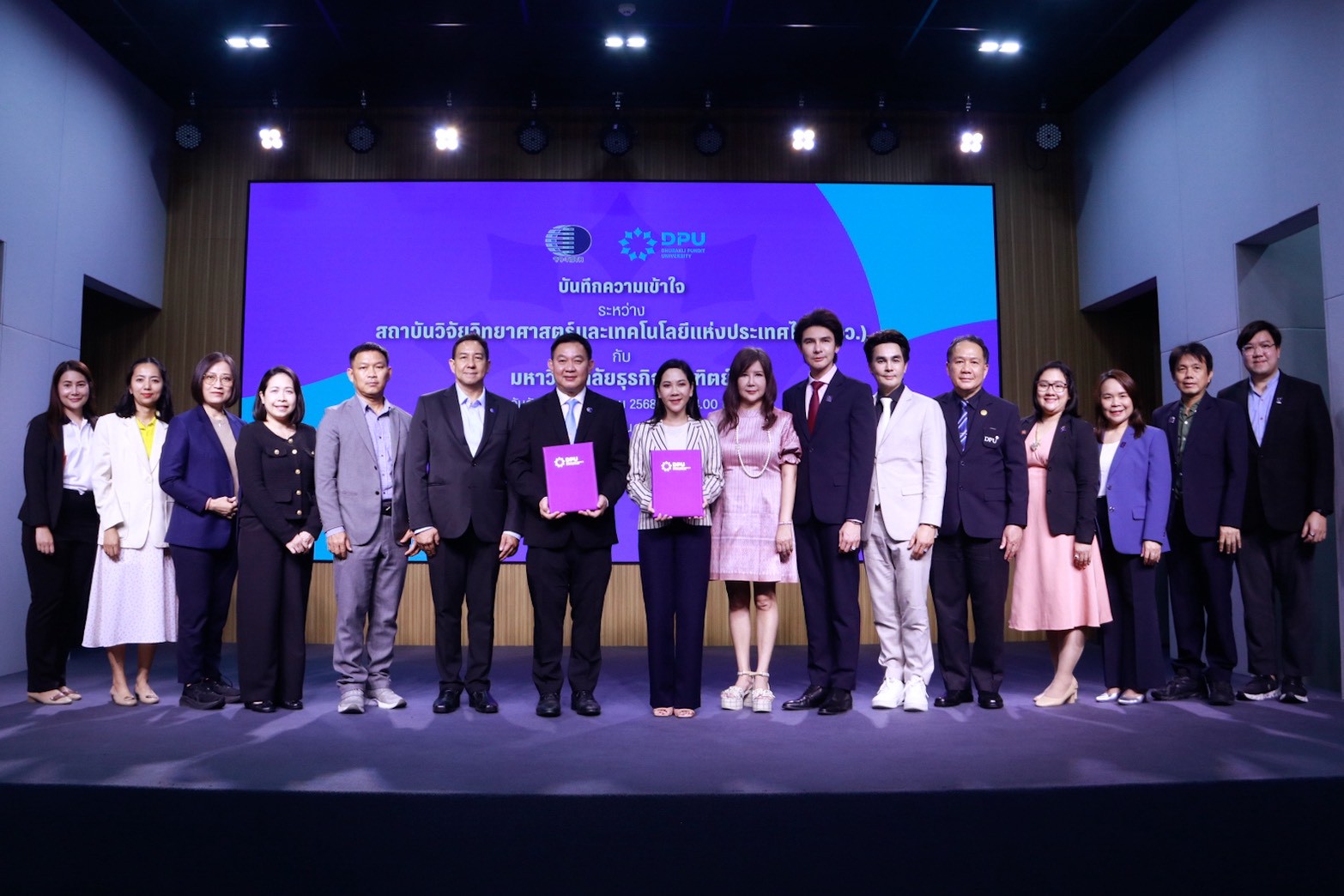กระทรวงการอุดมศึกษา วิทยาศาสตร์ วิจัยและนวัตกรรม (อว.) โดย ผศ.ดร.วีรชัย อาจหาญ ผู้ว่าการ สถาบันวิจัยวิทยาศาสตร์และเทคโนโลยีแห่งประเทศไทย (วว.) และ ดร.ดาริกา ลัทธพิพัฒน์ อธิการบดี มหาวิทยาลัยธุรกิจบัณฑิตย์ (DPU) ร่วมลงนามบันทึกข้อตกลงความเข้าใจว่าด้วยความร่วมมือในการศึกษา วิจัย และเชื่อมโยงเครือข่ายการพัฒนาผลิตภัณฑ์เพื่อส่งเสริมการมีสุขภาพที่ดี โดยมี ดร.พงศธร ประภักรางกูล รองผู้ว่าการวิจัยและพัฒนาด้านอุตสาหกรรมชีวภาพ วว. และ ผศ.ดร.พัทธนันท์ เพชรเชิดชู รองอธิการบดีสายงานวิชาการและวิจัยร่วมเป็นสักขีพยาน