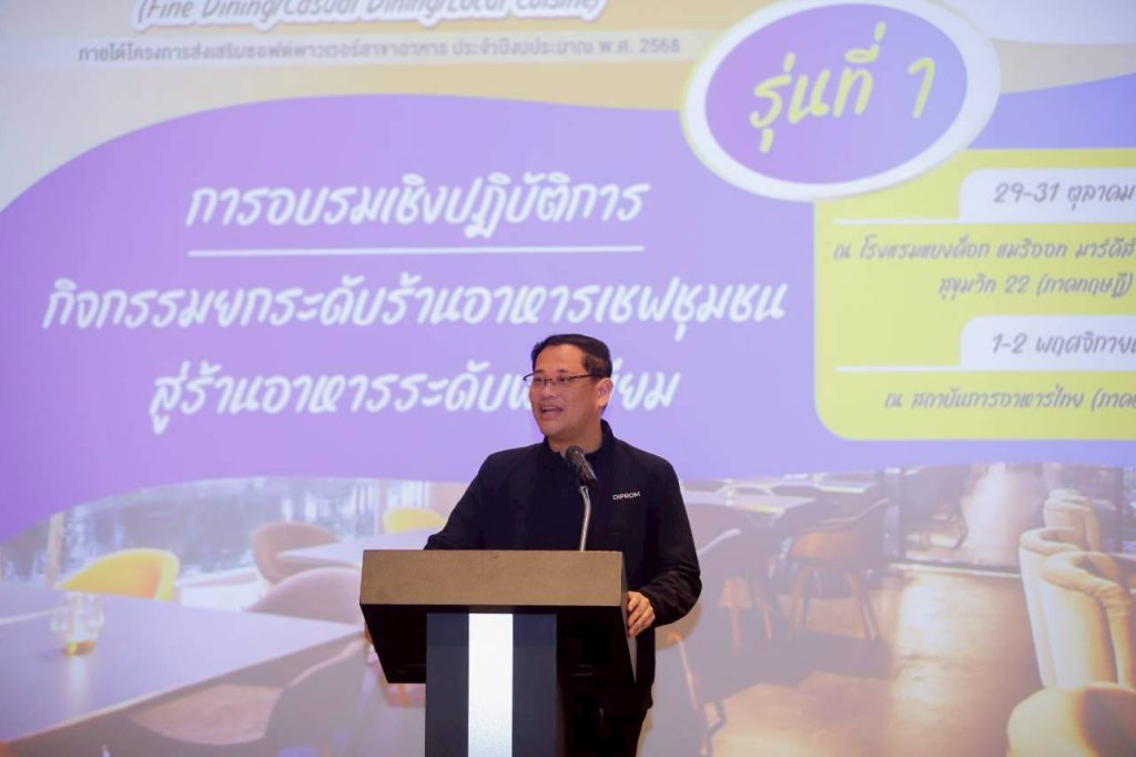 ดร.พลาวุธ วงศ์วิวัฒน์ รองเลขาธิการคณะกรรมการอ้อยและน้ำตาลทราย ช่วยปฏิบัติราชการกรมส่งเสริมอุตสาหกรรม ปฏิบัติหน้าที่ผู้อำนวยการกองพัฒนาอุตสาหกรรมชุมชน กระทรวงอุตสาหกรรม เป็นประธานเปิดการอบรมเชิงปฏิบัติการหลักสูตร กิจกรรมยกระดับร้านอาหารเชฟชุมชนสู่ร้านอาหาระดับพรีเมียม (Fine Dining/Casual Dining/Local Cuisine) ภายใต้โครงการส่งเสริมซอฟต์พาวเวอร์สาขาอาหาร รุ่นที่ 1 ซึ่ง กรมส่งเสริมอุตสาหกรรม ร่วมกับ สถาบันวิจัยวิทยาศาสตร์และเทคโนโลยีแห่งประเทศไทย (วว.) กระทรวงการอุดมศึกษา วิทยาศาสตร์ วิจัยและนวัตกรรม (อว.) จัดขึ้นระหว่างวันที่ 29-31 ตุลาคม 2568 ณ โรงแรมแบงค็อก แมริออท มาร์คีส์ ควีนส์ปาร์ค สุขุมวิท 22 กรุงเทพฯ