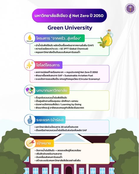 กลุ่มที่ 3 “มหาวิทยาลัยสีเขียวสู่ Net Zero ปี 2050” สนับสนุนการตั้งจุดรวบรวมน้ำมันพืชใช้แล้วในมหาวิทยาลัยนำร่องกว่า 20 แห่งทั่วประเทศมาผลิตเป็นเชื้อเพลิงอากาศยาน