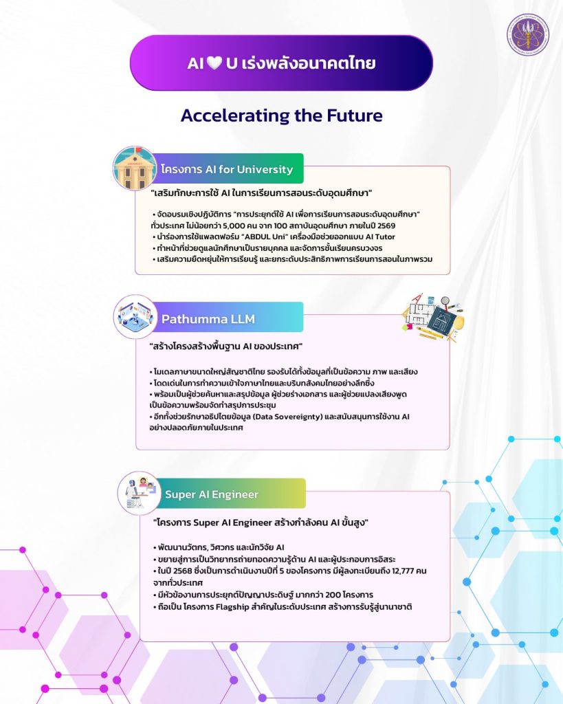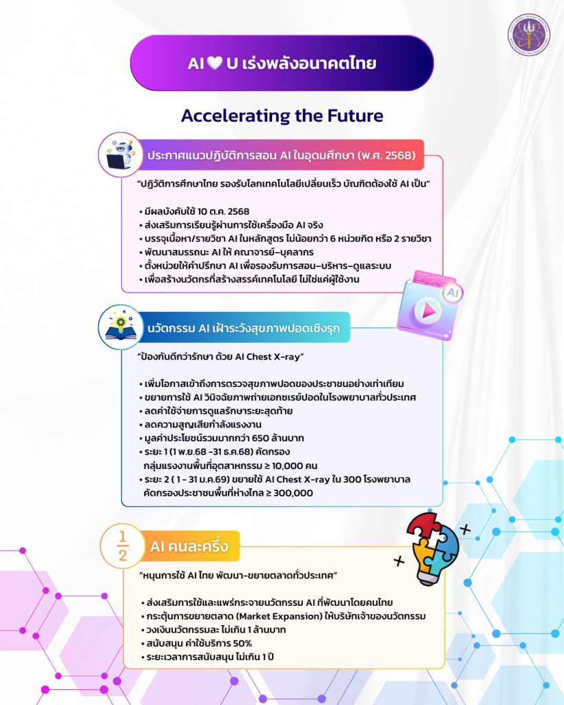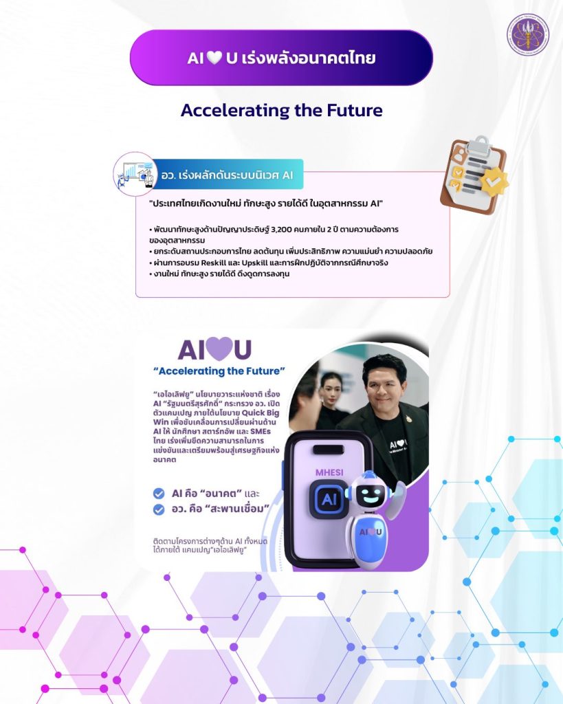 กลุ่มที่ 5 “AI love U (เอไอเลิฟยู) เร่งพลังอนาคตไทย Accelerating the Future” มีการลงนามประกาศกระทรวง อว. เรื่อง “แนวปฏิบัติเกี่ยวกับการจัดการเรียนการสอนด้านปัญญาประดิษฐ์ (AI) ในหลักสูตรการศึกษาของสถาบันอุดมศึกษา พ.ศ. 2568” เพื่อยกระดับการศึกษาให้ทันสมัย รองรับตลาดแรงงานที่เปลี่ยนแปลงเร็ว