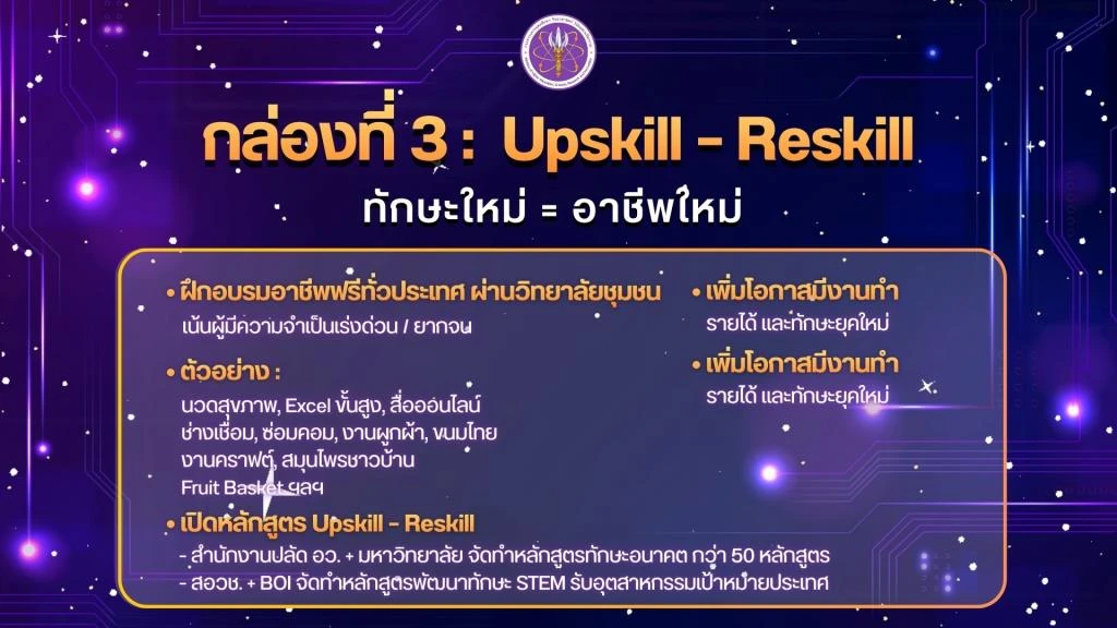 3) Upskill – Reskill เปลี่ยนความรู้เป็นอาชีพ เปลี่ยนทักษะเป็นอนาคต โดยเน้นหลักสูตร Future Skill หรือทักษะแห่งอนาคตที่จำเป็นในศตวรรษที่ 21 กว่า 50 หลักสูตร
