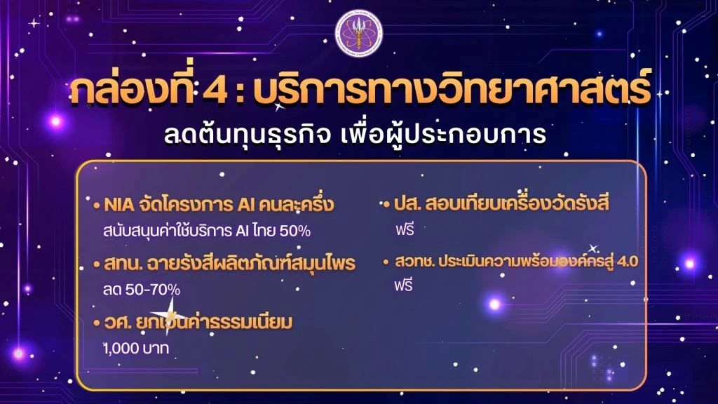4) ให้บริการทางวิทยาศาสตร์ ทั้งยกเว้นค่าธรรมเนียม ลดค่าบริการ และให้บริการฟรีเพื่อผู้ประกอบการ