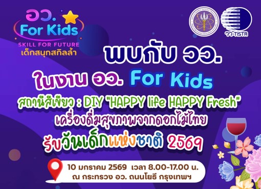 ซึ่งน้องๆ และผู้ปกครองที่เข้าร่วมกิจกรรม ในวันที่ 10 มกราคม 2569 จะได้สนุกและลงมือทำด้วยตัวเอง ในกิจกรรม DIY ที่ วว. นำ วิทยาศาสตร์ เทคโนโลยีและนวัตกรรม (วทน.) ช่วยเพิ่มทักษะให้กับนักวิทย์น้อย ด้วยการทำน้ำดื่มเพื่อสุขภาพจากดอกไม้ของไทย พร้อมเทคนิคการทำสเฟียร์ (เม็ดบีดส์) แบบง่ายๆ ที่สามารถนำไปต่อยอดเป็นอาชีพเสริมได้ นอกจากนี้ยังมีกิจกรรมเกมเสริมทักษะ พร้อมมอบของรางวัลมากมาย…วว. ขอเชิญชวนน้องๆ และผู้ปกครองเข้าร่วมกิจกรรมดังกล่าว ณ บูธ หมายเลข 15 ณ กระทรวง อว. ถนนโยธี กรุงเทพฯ
