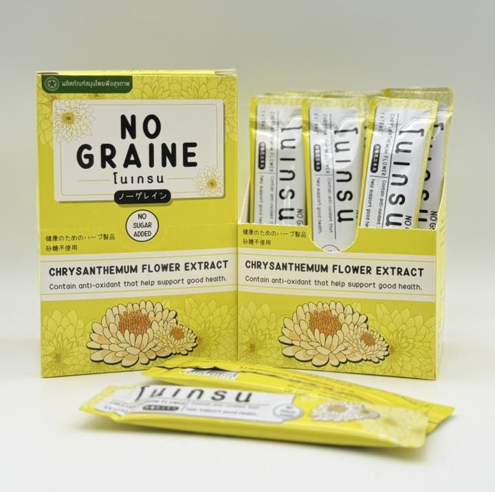 ผลิตภัณฑ์ NO GRAINE … คุณค่าจากธรรมชาติเพื่อคนยุคใหม่ ถูกพัฒนาต่อยอดให้ตอบโจทย์ไลฟ์สไตล์ปัจจุบัน ในรูปแบบผงชงละลายน้ำ (Instant Powder) ที่คงเอกลักษณ์กลิ่นหอมของเก๊กฮวยธรรมชาติ พร้อมชูจุดเด่น สูตรปราศจากน้ำตาล (No Sugar Added) เพื่อให้เป็นผลิตภัณฑ์สุขภาพที่เหมาะสำหรับกลุ่มคนวัยทำงานและผู้ที่มีปัญหาสุขภาพปวดศีรษะเรื้อรัง