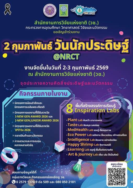 ผศ.ดร.วีรชัย อาจหาญ ผู้ว่าการ สถาบันวิจัยวิทยาศาสตร์และเทคโนโลยีแห่งประเทศไทย (วว.) กระทรวงการอุดมศึกษา วิทยาศาสตร์ วิจัยและนวัตกรรม (อว.) ร่วมเป็นเกียรติและเยี่ยมชมงาน “2 กุมภาพันธ์ วันนักประดิษฐ์ @NRCT” ซึ่ง สำนักงานการวิจัยแห่งชาติ (วช.) จัดขึ้นระหว่างวันที่ 2 – 3 กุมภาพันธ์ 2569 เวลา 09.00-16.00 น. ณ อาคาร วช. 8 ชั้น 2 บางเขน กรุงเทพฯ