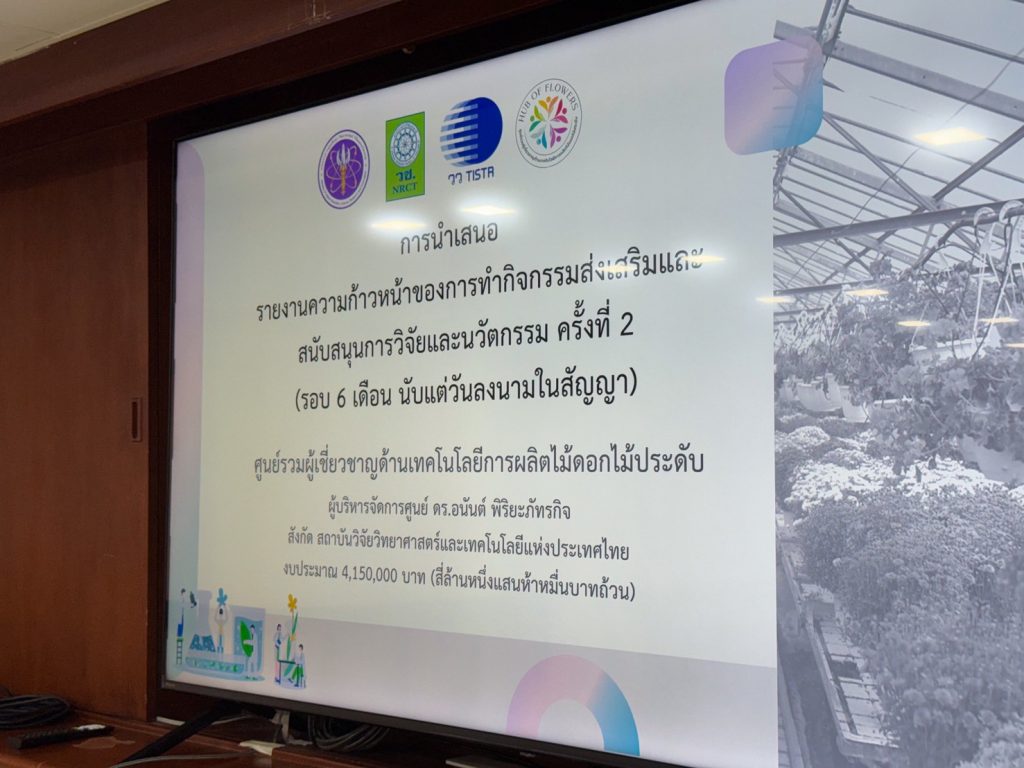 ดร.อนันต์ พิริยะภัทรกิจ นักวิจัยอาวุโส ศูนย์เชี่ยวชาญนวัตกรรมเกษตรสร้างสรรค์ (ศนก.) สถาบันวิจัยวิทยาศาสตร์และเทคโนโลยีแห่งประเทศไทย (วว.) กระทรวงการอุดมศึกษา วิทยาศาสตร์ วิจัยและนวัตกรรม (อว.)ในฐานะผู้บริหารศูนย์รวมผู้เชี่ยวขาญด้านเทคโนโลยีการผลิตไม้ดอกไม้ประดับ ( Hub of Talents Flower and Ornamental Plant Production Technology : Hub of Flowers) พร้อมทีมวิจัย นำเสนอรายงานความก้าวหน้าของการทำกิจกรรมส่งเสริมและสนับสนุนการวิจัยและนวัตกรรม ครั้งที่ 2 ต่อคณะผู้ทรงคุณวุฒิ สำนักงานการวิจัยแห่งชาติ (วช.) เมื่อวันที่ 23 มีนาคม 2569 ณ จังหวัดอุดรธานี