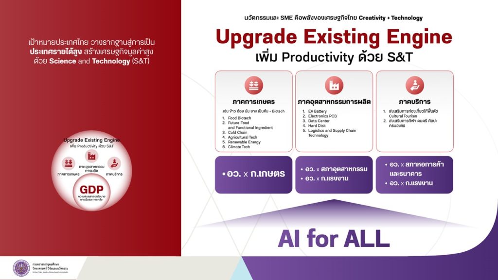 *** อันจะนำไปสู่เป้าหมายของประเทศไทย วางรากฐานสู่การเป็น “ประเทศรายได้สูง” สร้างเศรษฐกิจมูลค่าสูง ด้วย Science and Technology (S&T) เพื่อรายได้ของประชาชน คุณภาพชีวิตของครอบครัว และโอกาสของลูกหลานในอนาคต***
