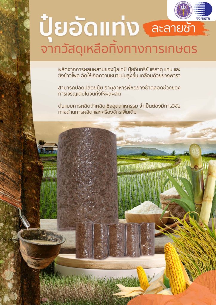 กระทรวงการอุดมศึกษา วิทยาศาสตร์ วิจัยและนวัตกรรม (อว.) โดย สถาบันวิจัยวิทยาศาสตร์และเทคโนโลยีแห่งประเทศไทย (วว.) วิจัยและพัฒนา “ปุ๋ยอัดแท่ง…ละลายช้า” เพิ่มมูลค่าวัสดุเหลือทิ้งทางการเกษตร (ซังข้าวโพด) พร้อมใช้ประโยชน์จากยางพาราในการเคลือบผลิตภัณฑ์ปุ๋ย…เป็นผลิตภัณฑ์ที่มีประสิทธิภาพในการปลดปล่อยธาตุอาหาร เหมาะสำหรับนำไปประกอบอาชีพ เพิ่มมิติความหลากหลายของผลิตภัณฑ์การเกษตร หรือทำเป็นอาชีพเสริม สร้างรายได้ที่มั่นคง เสริมแกร่งเศรษฐกิจครัวเรือน ธุรกิจ และภาพรวมของประเทศในสถานการณ์ที่มีภาวะเศรษฐกิจปัจจุบัน