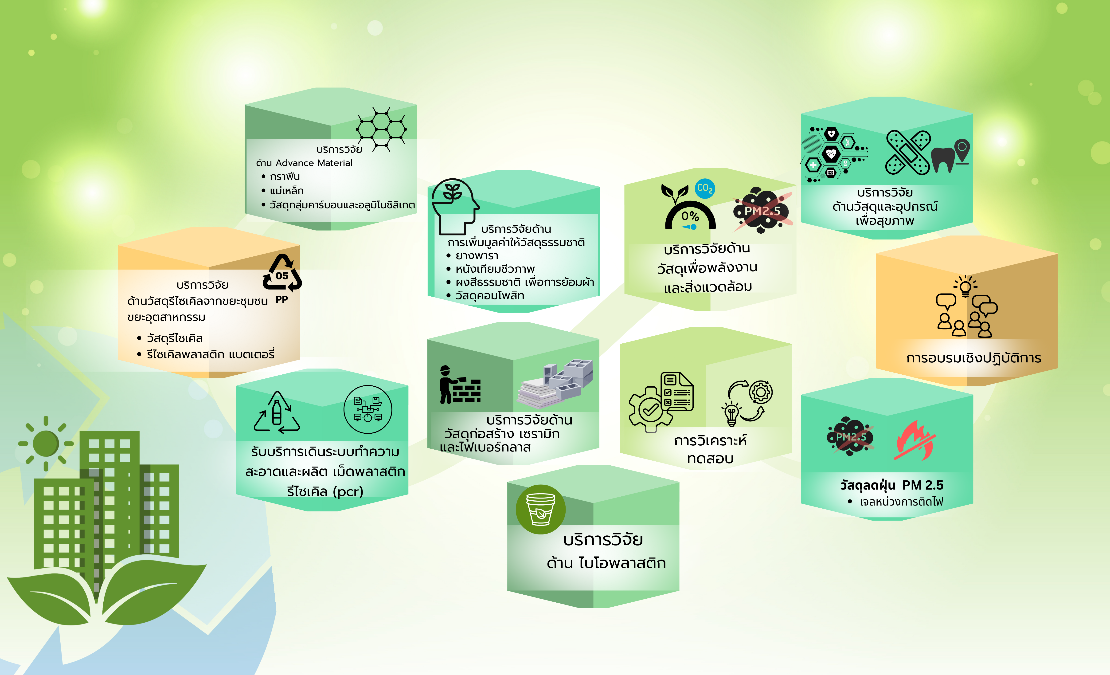 วิจัยและพัฒนาเทคโนโลยีและนวัตกรรมด้านวัสดุ เพื่อประยุกต์ใช้ในภาคอุตสาหกรรม เช่น นวัตกรรมวัสดุสุขภาพ วัสดุด้านพลังงานและสิ่งแวดล้อม การสร้างมูลค่าเพิ่มจากวัสดุธรรมชาติ เพื่อลดการนำเข้า ลดต้นทุนการผลิต และเสริมสร้างขีดความสามารถในการแข่งขันให้กับภาคอุตสาหกรรม ตลอดจนสร้างรายได้ให้กับชุมชนอย่างยั่งยืน
