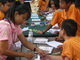 ทำผ้ามัดย้อมต่างพร้อมกันทำ มัดผ้าเป็นกำจุ่มสีใส่ไป